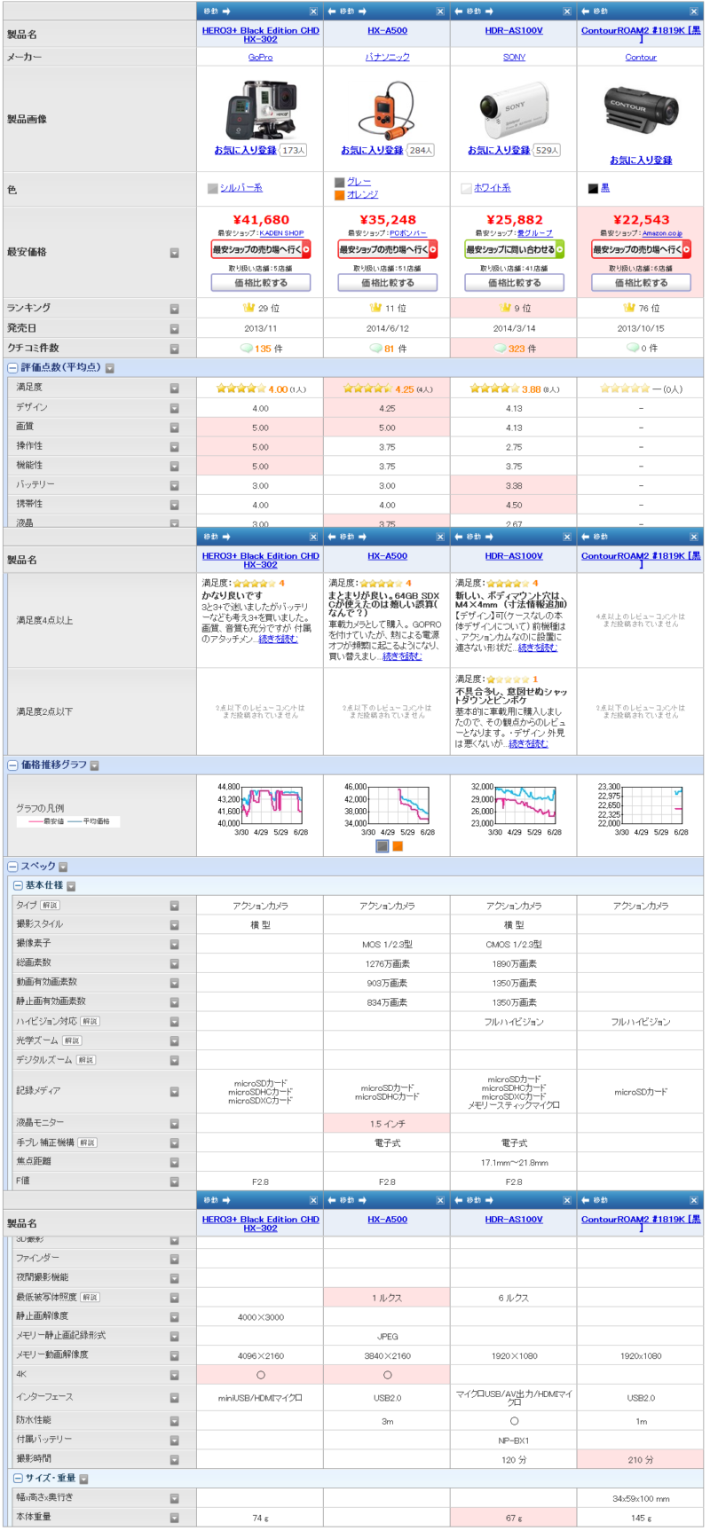 各社のアクションカメラを見ることができます。わかりやすい比較表とか置いてくれればいいのに。