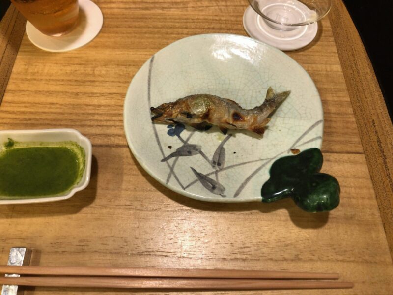 琵琶湖でとれた若鮎は大将が目の前で炭火で焼いてくださいます。